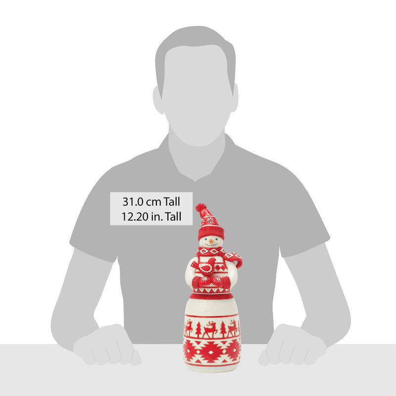Figurine d'un bonhomme de neige Nordique aux motifs rouges, avec des gants, une écharpe et un bonnet tricoté, tient un délicat cardinal dans ses mains avec un sourire chaleureux. Conçue par l'artiste primé Jim Shore pour la collection Heartwood Creek. Chaque figurine est peinte à la main et de légères variations de couleur sont à prévoir, ce qui rend chaque pièce unique. Ces articles ne sont pas des jouets pour enfants. Destiné aux adultes uniquement.