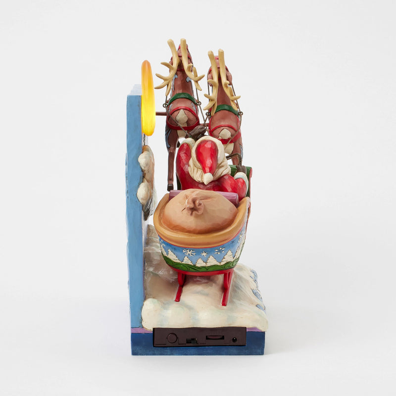 "Cette figurine mettant en avant cette scène enchantée s'illumine grâce à des LED, dévoilant le vol féerique du Père Noël à travers le ciel étoilé, accompagné de ses rennes. Sous l'éclat de la lune et des lanternes, ils prennent leur envol, bercés par la mélodie de ""Up on the House Top"". Cette figurine requiert des piles 3-AAA (non fournies). Conçue par l'artiste primé Jim Shore pour la collection Heartwood Creek. Chaque figurine est peinte à la main et de légères variations de couleur sont à prévoir, ce qui rend chaque pièce unique. Ces articles ne sont pas des jouets pour enfants. Destiné aux adultes uniquement. "