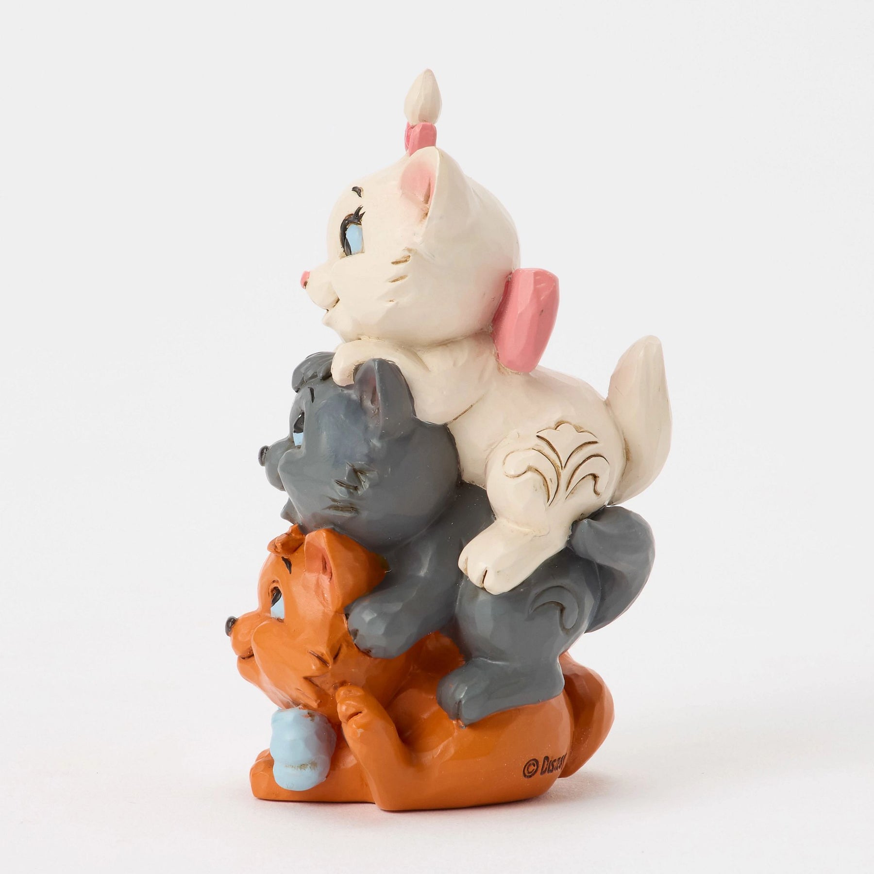 "Cette adorable création signée Jim Shore met en scène les chatons des Aristochats empilés les uns sur les autres dans un joyeux désordre. Toulouse forme la base, tandis que Berlioz et Marie se tiennent en équilibre au-dessus, affichant de grands sourires complices. Gâtés et insouciants, ces trois petits aristochats sont loin de se douter des leçons de vie qui les attendent après leur enlèvement… Ces figurines ne sont pas des jouets pour enfants. Destiné aux adultes uniquement."