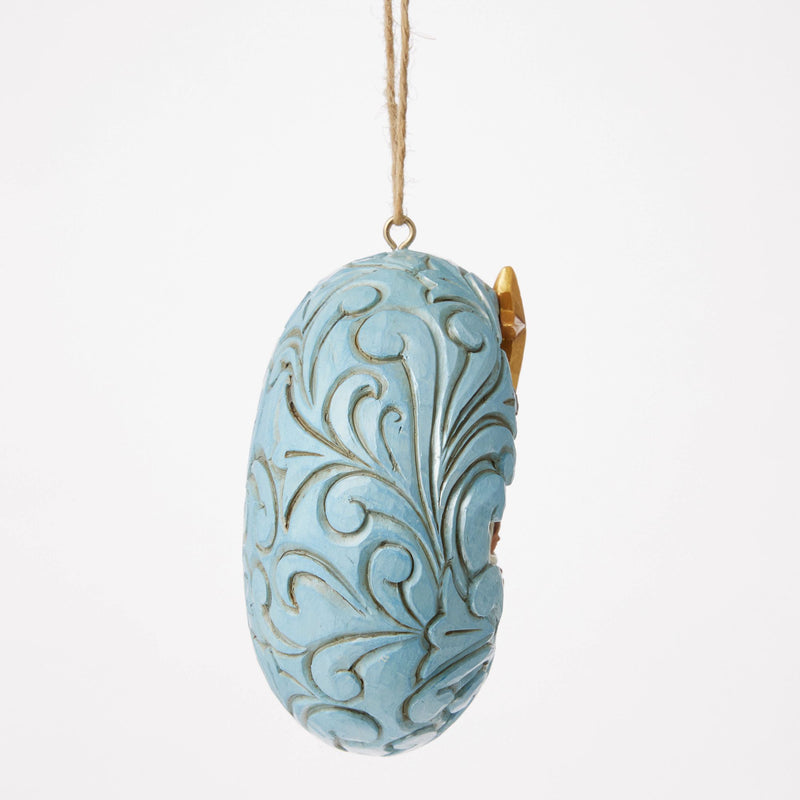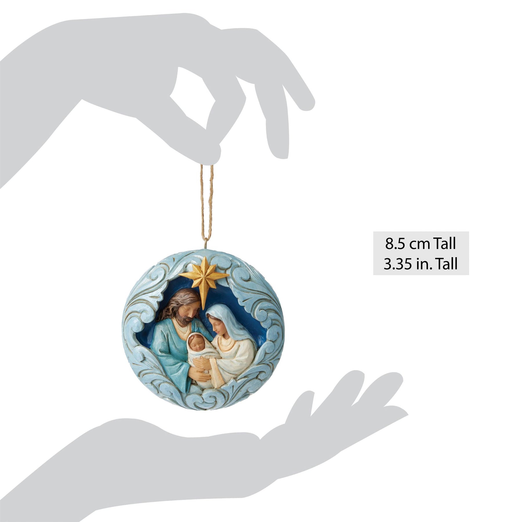 Cette suspension Jim Shore représente la Sainte Famille, avec l'étoile dorée de Noël qui brille au-dessus d'eux sur un fond bleu apaisant. Les nombreux détails raffinés dégagent une sensation de paix et de merveille divine. Conçue par l'artiste primé Jim Shore pour la collection Heartwood Creek. Chaque figurine est peinte à la main et de légères variations de couleur sont à prévoir, ce qui rend chaque pièce unique. Ces articles ne sont pas des jouets pour enfants. Destiné aux adultes uniquement.